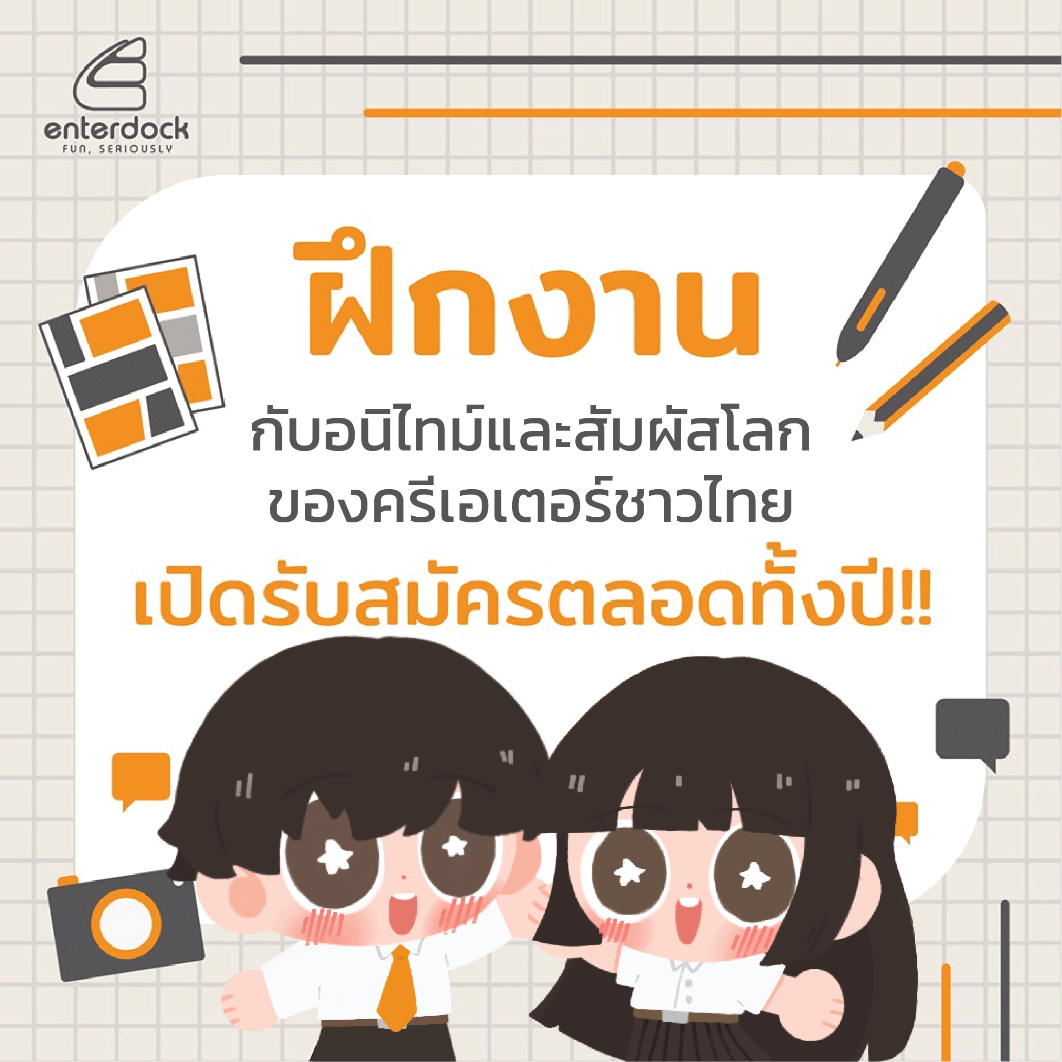 บริษัท เอ็นเทอร์ด็อค จำกัด และ อนิไทม์ ผู้บริหารร้านมัลติแบรนด์ของครีเอเตอร์ชาวไทย อีฟสโตร์ อาร์ต แอนด์ คาระ และ อนิไทม์ ครีเอเตอร์ สโตร์ แบงคอก และผู้จัดกิจกรรมเพื่อครีเอเตอร์ชาวไทย อาทิ COMIC SQUARE และ Illust Fusion ประกอบร่างสร้างเส้น เปิดรับนักศึกษาฝึกงานที่สนใจฝึกฝนทักษะความสามารถและสัมผัสประสบการณ์ในแวดวงการ์ตูนที่หาที่อื่นไม่ได้ในฝ่ายต่างๆ ในหลายอัตรา